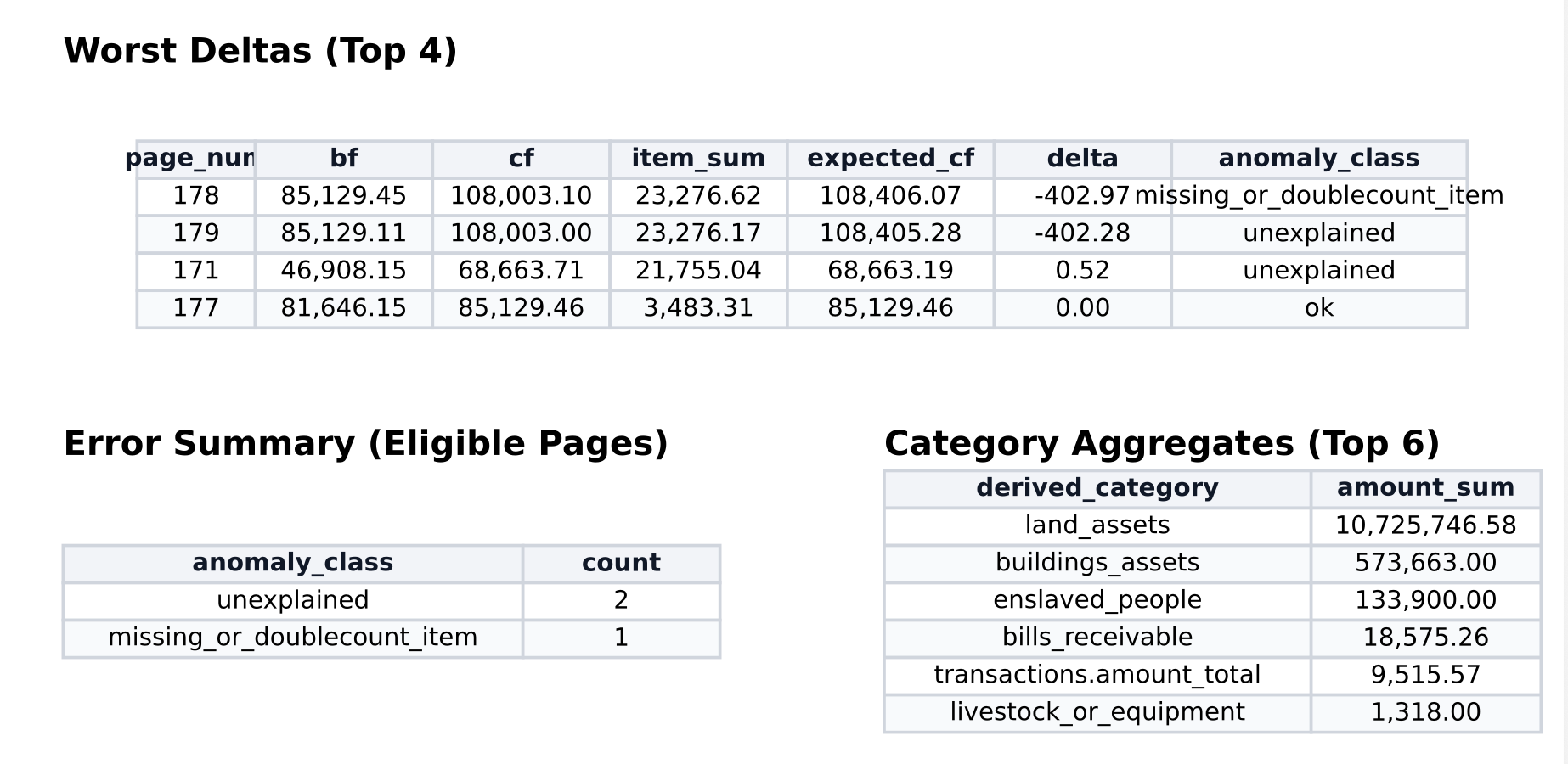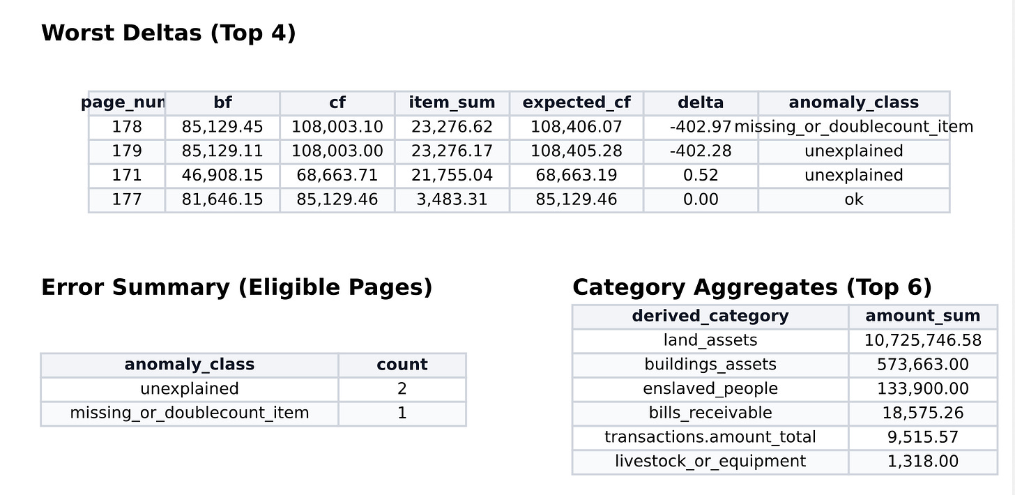 Once I had the JSON, I turned to Claude. I showed it sample files and asked it to write a script that extracted everything into a spreadsheet. That alone was extraordinarily useful for getting a handle on thousands of entries. Next I asked it to verify the arithmetic: on every page, a running total recorded the estate’s cumulative value, and I wanted to check every page’s actual summed entries against that figure. There were minor discrepancies but nothing significant. (And I did this same exercise in Notebook LLM with some inaccurate, non-reproducible results. When counting, always use offline code!)