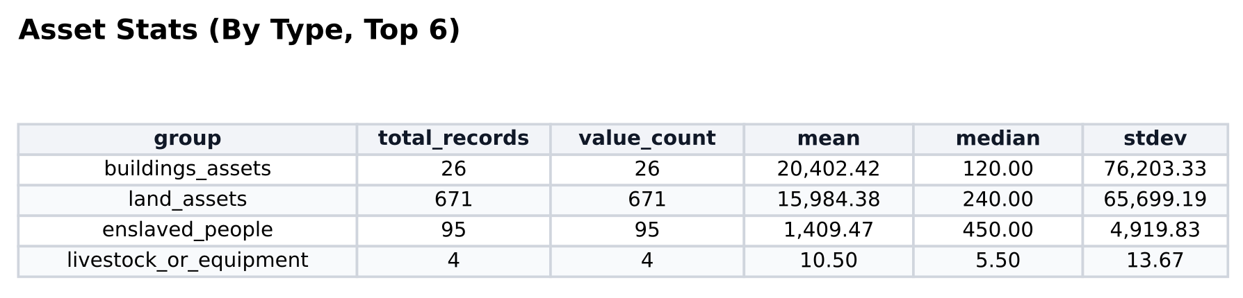 From there it was straightforward to generate summary statistics—mean, median, range—and visualizations of how the estate’s value was distributed across asset classes. I could see at a glance exactly how much of McDonogh’s estate was held in financial instruments, in land, in buildings, and crucially, in people.